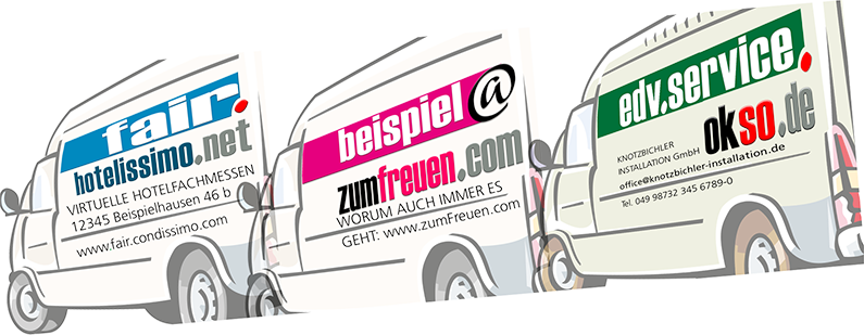 Analog e Mail Adressen eignen sich noch einen Tick besser als SubDomains. Einerseits, weil das @ Begriffe sinngemäß verbinden kann, andererseits weil diese Werbung wegen fehlender, starker Domains noch lange neu und ungewöhnlich bleiben wird. Nur wenige Domains eignen sich dafür! Firmenwägen sind hervorragende Kontakt-Multiplikatoren, Mini-Inserate fallen clever platziert mehr als viele Mehrspalter auf, die Botschaft auf Bannern sagt alles auf einen Blick ... Das ist besonders im lokalen / regionalen Einsatz von Vorteil, weil es auch die Wiedererkennung fördert. e Mail Adressen nutzen Sie konventionell (Nachrichten werden auf Ihre Adresse umgeleitet) oder via autoresponse Funktion mit (Back)Links zu angebotsbezogenen Seiten Ihrer Homepage. Testen Sie oberberg@hotelissimo.de |